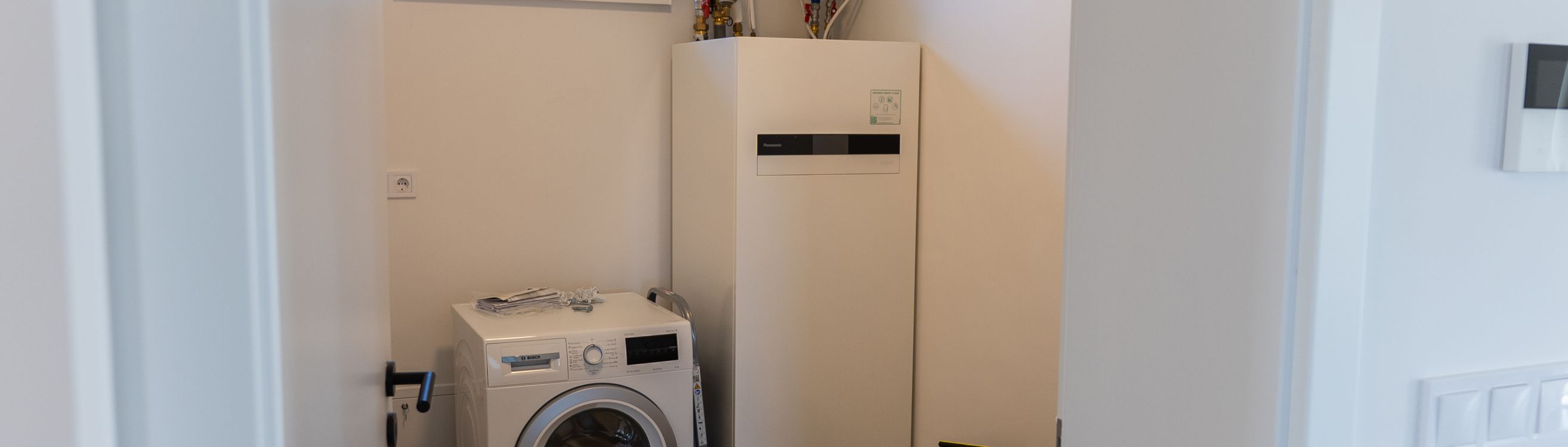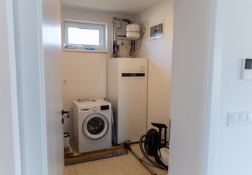 Az Amazonit 2.0 egyik kiemelkedő előnye a nagyobb háztartási helyiség, ahol kényelmesen elfér a mosógép, a szárítógép, a hőszivattyú, és még a vasaláshoz is elegendő hely marad. Ez a praktikus kialakítás segít abban, hogy a háztartási funkciók elkülönüljenek a lakótértől, miközben minden rendszerezetten és átláthatóan működik.